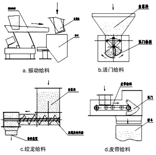 圖1中一部分也可以根據(jù)物料特性相互結(jié)合起來使用,通過在各種給料結(jié)構(gòu)上采取相應(yīng)措施產(chǎn)生符合要求的粗細給料組合,例如利用振動和活門給料結(jié)合,利用給料槽的不同尺寸,利用絞龍或皮帶電機的不同速度等。 其中給料裝置結(jié)構(gòu)形式較多,主要有:電磁(電機)振動式、重力(活門或插板)式、螺旋(絞龍)推進式、皮帶輸送式、強流給料等。
