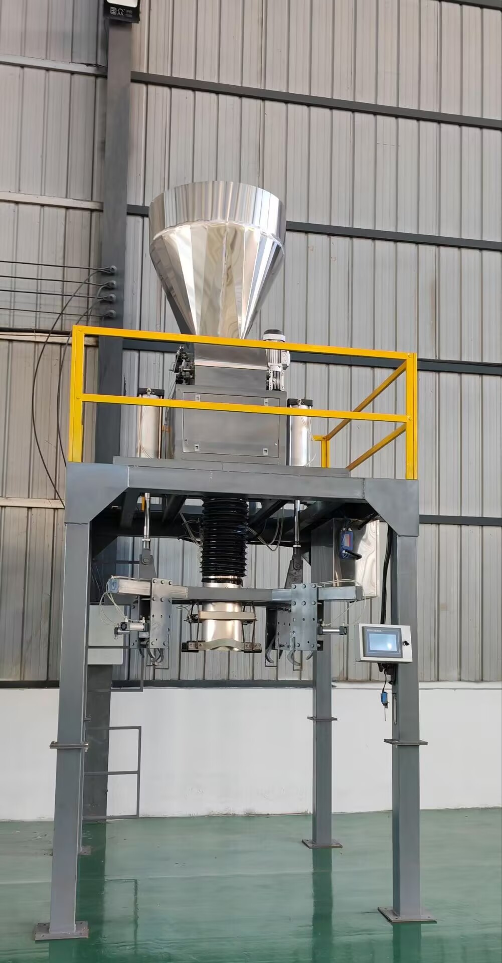 上海鑄衡工廠生產的這臺鉀肥噸袋自動噸包機采用單/雙螺旋強制給料控制系統,無級變頻調速控制給料速度,快速給料由大小螺旋快速進料,慢速給料由小螺旋精加料完成,結合精度控制閥實現包裝速度和精度的自動控制,性能穩定可靠。灌裝時只需人工掛袋,給定信號后,便可完成自動灌裝、自動計量、滿稱時自動停機、松袋的工作循環, 由叉車或輸送機直接輸出后吊裝儲運。